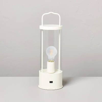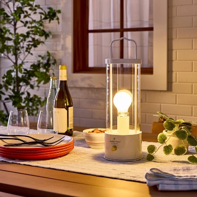Illuminate your outdoor space in sleek style with this Portable Outdoor Patio LED Tabletop Lantern from Hearth & Hand™ with Magnolia. This portable tabletop lantern features a glass shade with white metal frame for a mix of modern and functional style. The tabletop lantern comes with a top handle for convenient carrying, and a base dimmer switch that helps create the perfect outdoor setting. With a rust-resistant design, this LED lantern includes a rechargeable battery for years of use.